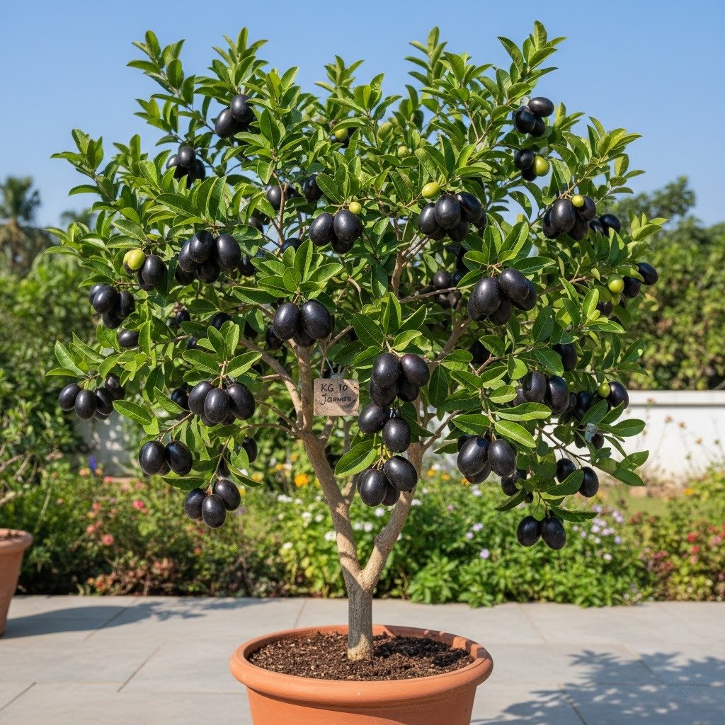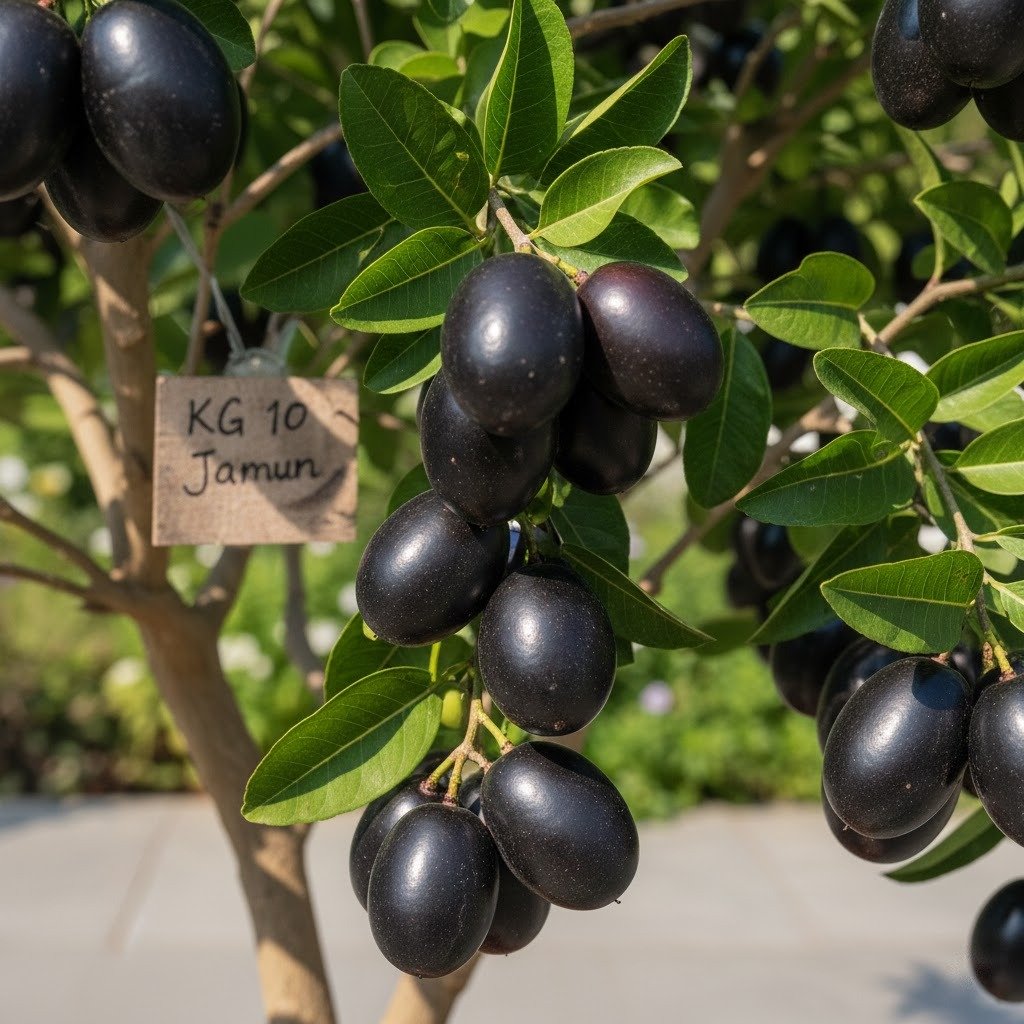 The KG 10 Jamun Plant is a selected cultivar of the jamun (also called java plum) developed for dependable yields, larger-than-average fruits, and strong tree vigour. KG 10 trees produce attractive, deep-coloured berries that are juicy, pleasantly astringent with a fruity sweetness, and excellent for fresh eating, juices, jams, ice creams and value-added products.